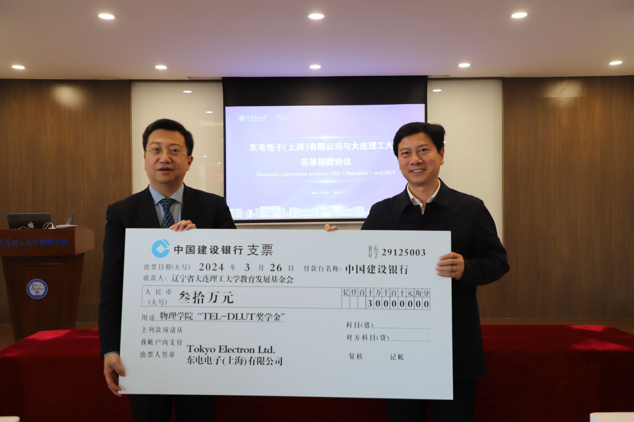 3月26日上午,乐鱼app登录入口“TEL-DLUT奖学金”捐赠签约暨颁奖仪式隆重举行。Tokyo Electron Ltd.(以下简称TEL集团)向乐鱼app登录入口捐资设立“TEL-DLUT奖学金”,用于支持等离子体物理学科人才培养。学校党委常委、副校长朱方伟、东电电子(上海)有限公司总监钱立群等出席仪式,TEL集团项目总监Yuji Tsukamoto等高管在TEL日本总部线上参会。