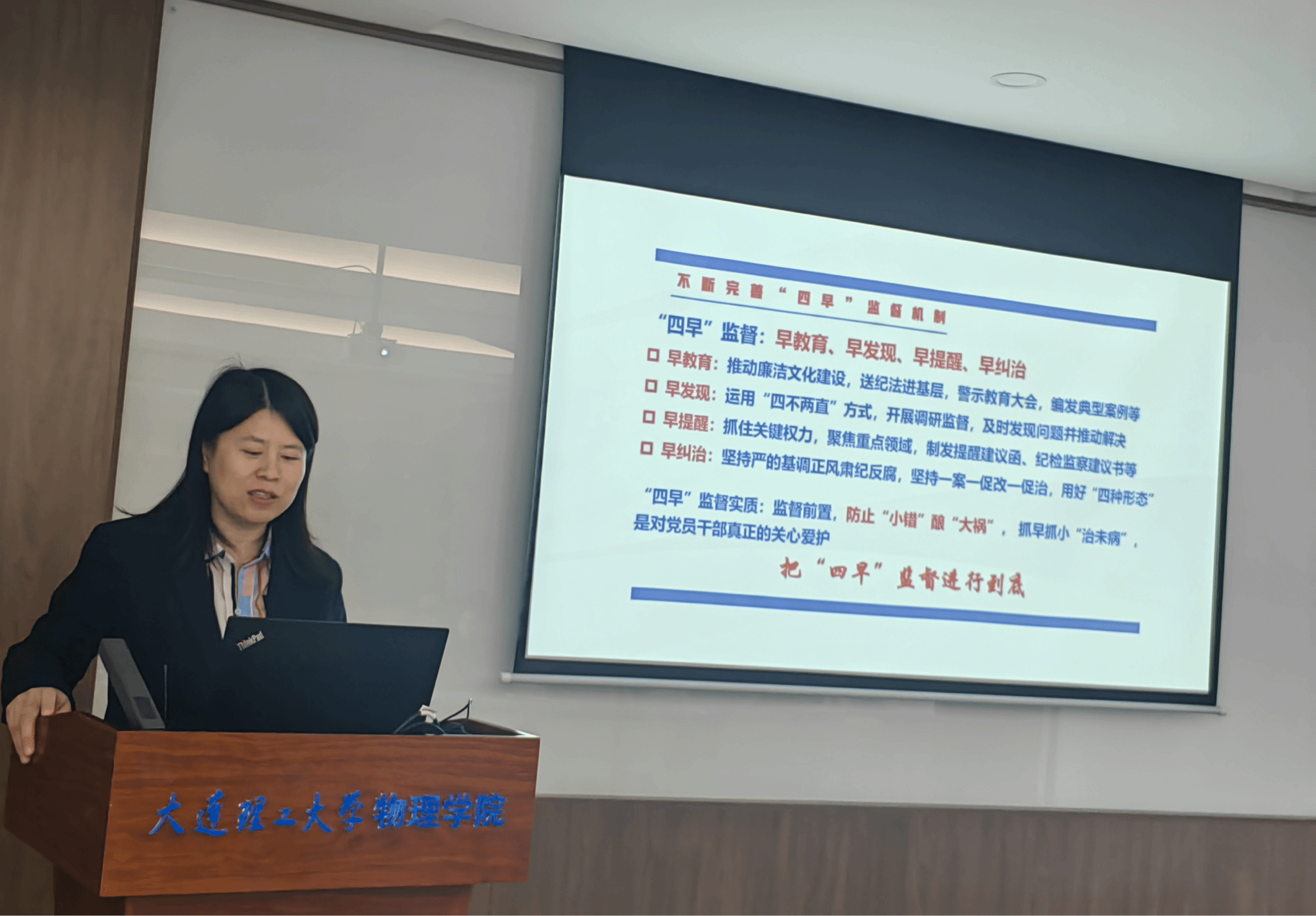 最后,于艳敏副书记对本次讲座进行简要总结,她指出,全体党员干部要深刻领会党纪学习教育的重要性,将本次讲座精神和要求贯彻落实到位;同时要吸取案件教训,自觉将铁一般的纪律作为约束日常行动的准绳。于艳敏副书记还强调,各基层党支部要深入学习贯彻《中共大连理工大学委员会关于在全校党员中开展党纪学习教育的实施方案》的具体指示和要求,通过党支部三会一课和主题党日等形式具体落实。