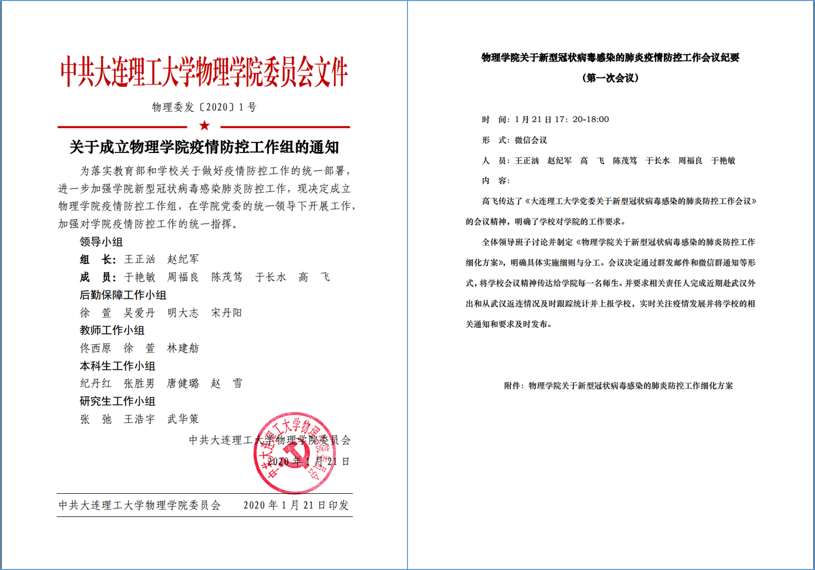 学校疫情防控工作伊始,乐鱼(中国)迅速成立了以党委书记王正汹、院长赵纪军为双组长的学院疫情防控工作组,明确该项工作由学院党委负责,领导班子全体成员参与并承担不同分工。学院党委参考 “一岗双责”要求,确定了领导班子各成员在疫情防控工作中的责任所在,相应按照党、政、研、本的划分成立了4个工作小组,将疫情防控工作的上级部署与院内事务进行了清晰的分配。