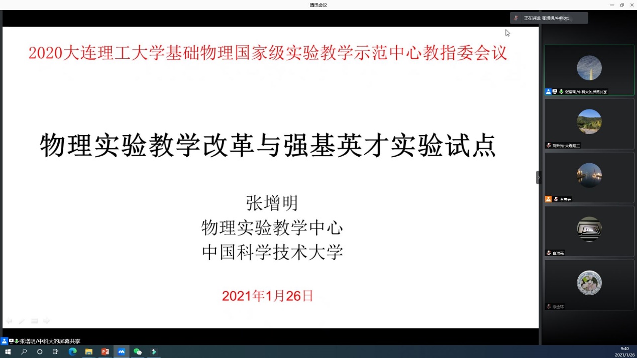 2020年1月26日,基础物理国家级实验教学示范中心(大连理工大学)教学指导委员会2020年年会通过腾讯会议的方式在线上召开。中心教学指导委员会主任、中国科技大学张增明教授、中心教学指导委员会委员华中科技大学熊永红教授、山东大学徐建强教授、东北师范大学李金环教授、大连理工大学余虹教授、大连理工大学李雪春教授以及实验中心的全体教师参加了会议。我校教务处副处长徐立昕教授、乐鱼(中国)副院长于长水教授出席会议。