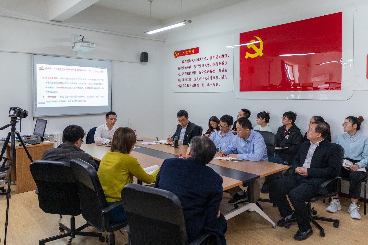 以党的二十大报告中的若干关键词为切入,桑超峰带领师生党员重温大会主题,复习报告精髓要义,着重阐述了“中国式现代化”“到2035年我国发展的总体目标”等党的二十大精神要点内容,将报告向“实施科教兴国战略,强化现代化建设人才支撑”部分过渡。