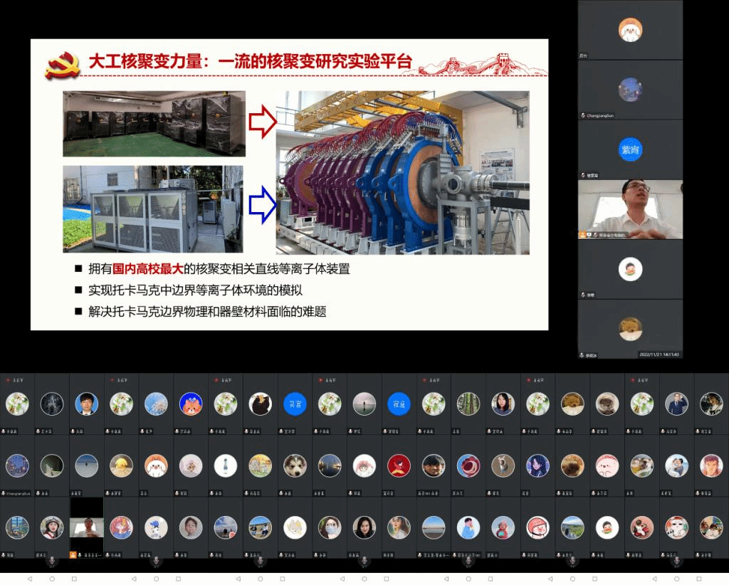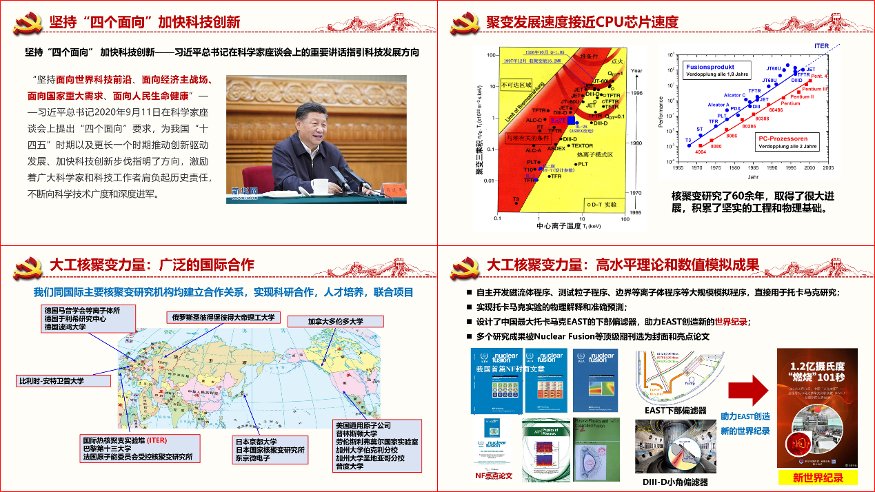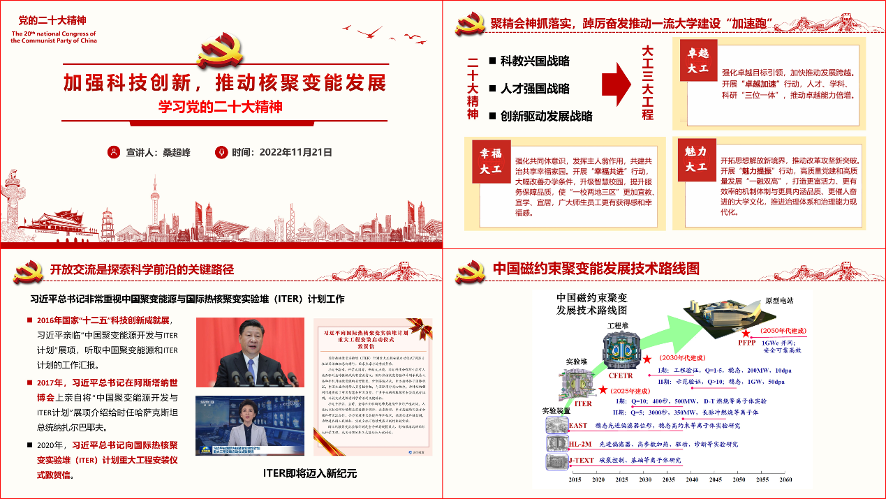 本次专题报告活动通过线上线下结合的方式开展,覆盖乐鱼(中国)全体师生党员。学院领导班子成员、党委委员、各党支部书记现场参加,学院党委书记王正汹主持活动并讲话,表示大科学计划是人类开拓知识前沿、探索未知世界和解决重大全球性问题的重要手段,我们在借鉴ITER经验的基础上,提出牵头组织国际核聚变示范堆计划方案建议,并面向能源需求谋划我国磁约束核聚变能发展战略及路线图,勉励师生党员将党的二十大精神学到深处、落到实处,心怀高远志向,做好本职工作,凝聚“大工力量”,奋进时代征程。