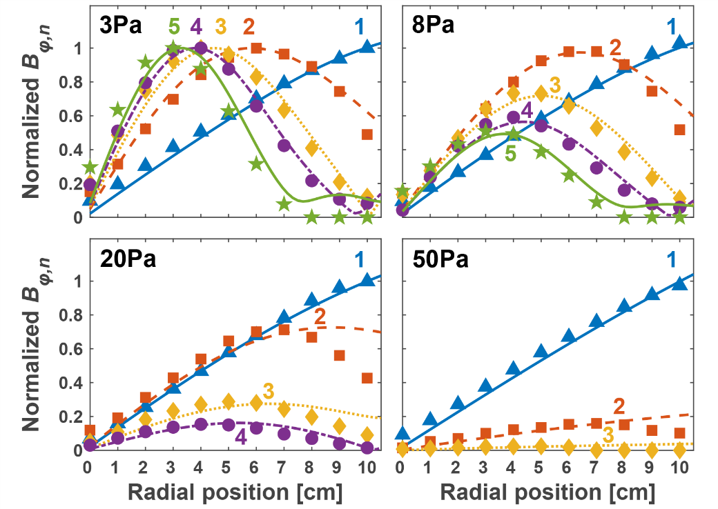 该课题组利用自主研制的高频磁探针,首次在实验上观测到低气压容性放电中由等离子体串联共振引起的高次谐波所激发的非线性驻波效应,并结合非线性传输线模型揭示了非线性驻波激发的物理机制。研究结果表明,在气压较低条件下,鞘层的非线性振荡会激发高次谐波,这些谐波在串联共振频率附近得到增强。在特定的放电条件下,这些非线性谐波将会引起径向驻波,导致放电电压及电流在极板中心处出现最大值,从而造成等离子体密度的“中心峰”分布。然而,随着气压的升高,高次谐波激发逐渐受到抑制(图1),并导致等离子体均匀性得到改善。