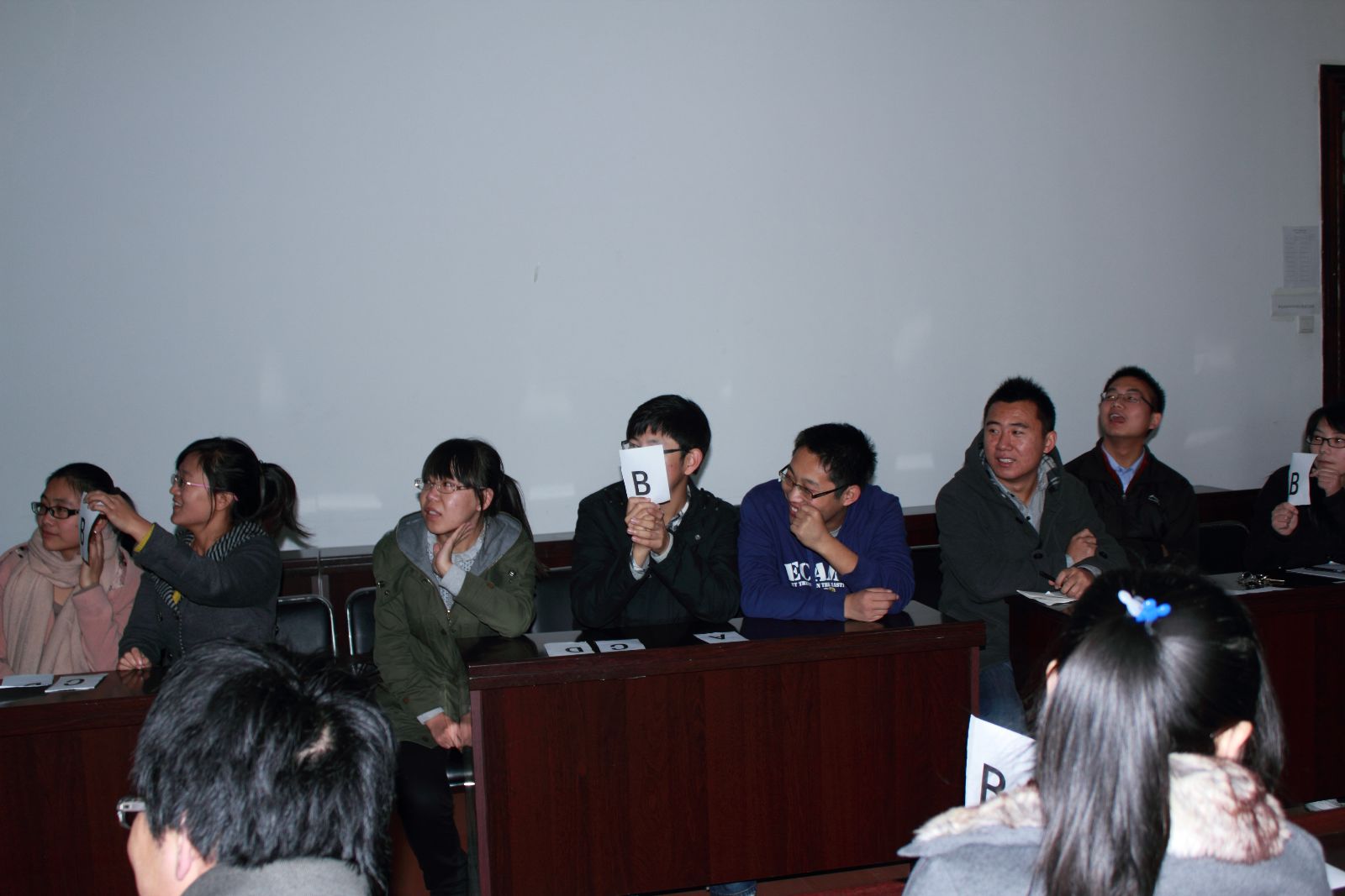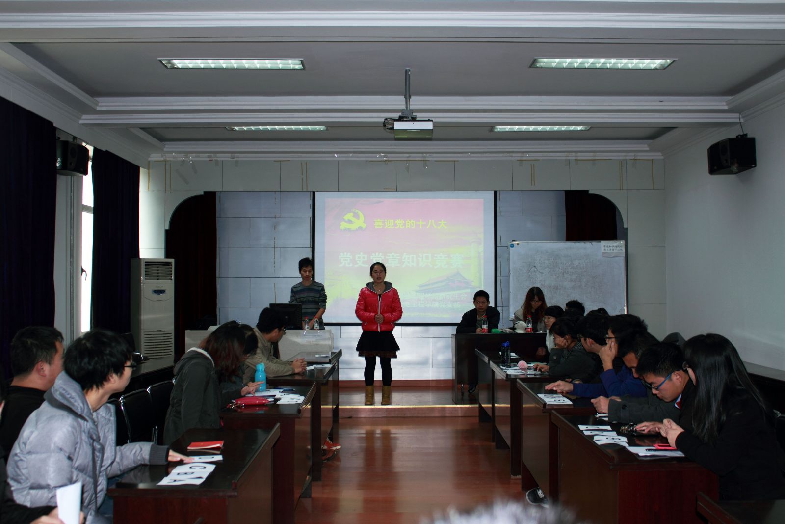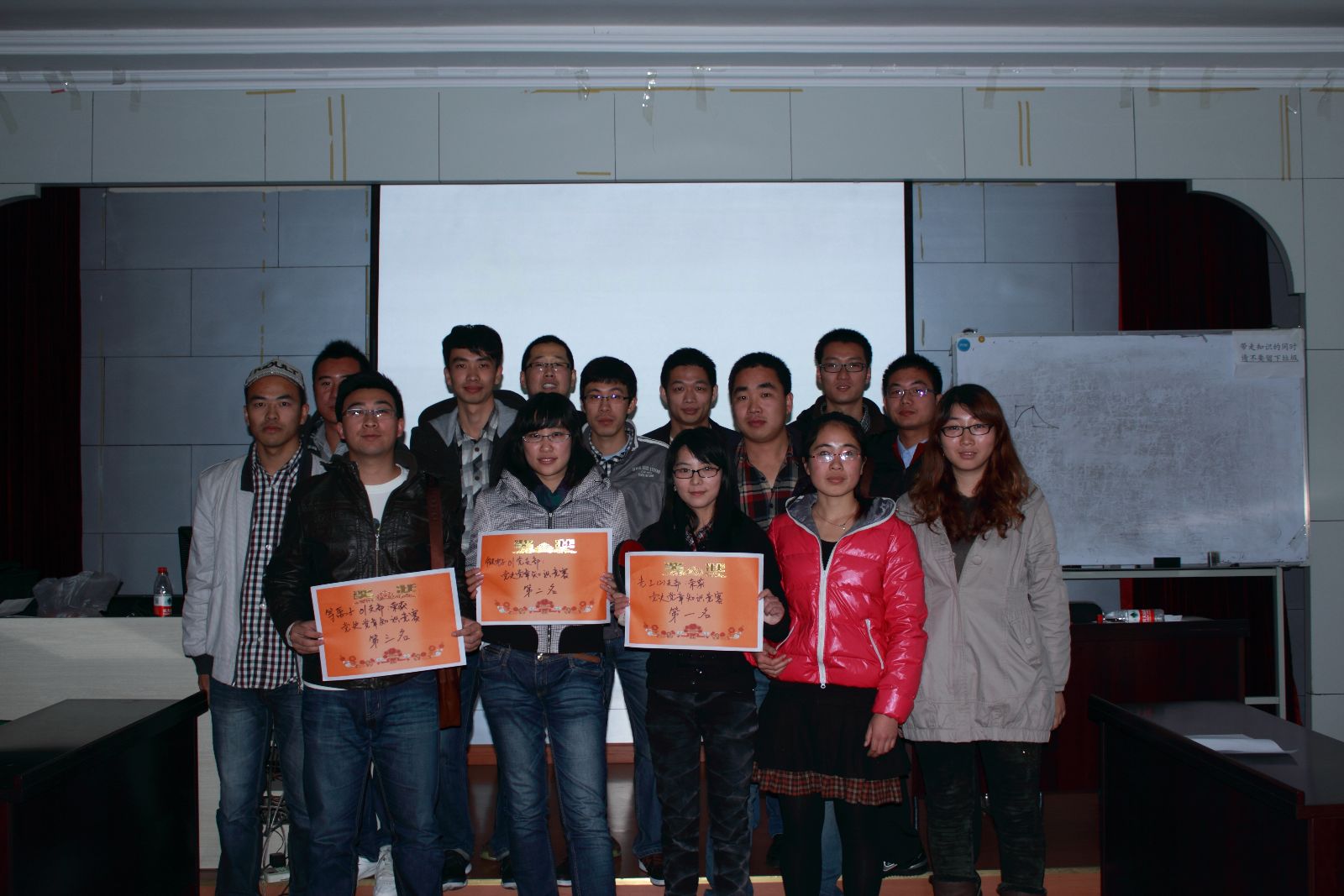 本次活动于2012年11月11日在物理系418举行。参加此次活动的由研究生党支部11支部参赛,每个支部组成一个团队,共37人参加。此次活动共有3个环节,第一环节为必答题,经过此环节淘汰5个队,剩下的6个队进入第二环节:抢答题。次过此环节淘汰3个队。剩下的3个队进入最后的争冠环节。经过3轮的激烈答题,最后的结果是:一等奖:光工02党支部,二等奖:微电子01党支部,三等奖:凝聚态01党支部。最后我们给获胜队进行了颁奖。
