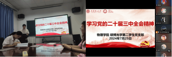 2024年7月15日至18日,党的二十届三中全会在北京顺利召开。这次全会,是在以中国式现代化全面推进强国建设、民族复兴伟业的关键时期举行的一次十分重要的会议。为帮助支部党员同志深入学习党的二十届三中全会精神,乐鱼(中国)硕博光学第二学生党支部于2024年7月25日晚上6点在物理楼425及腾讯会议召开党员大会。会议由支部书记田杰同志主持,支部全体党员参加。本次大会旨在系统深入学习领会党的二十届三中全会精神。