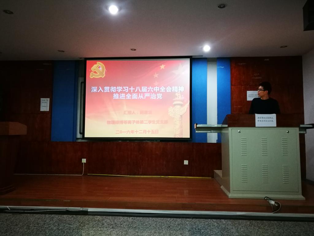 20161215日,为了深入学习党的十八届六中全会精神,切实了解党中央实施全面从严治党的方针政策,进一步提高党员的政治思想觉悟、党员意识,物理硕博等离子体第二学生党支部于系楼322会议室专题学习党的十八届六中全会精神。会议由党支部书记胡艳婷同志主持,支部全体在校党员参加了会议。