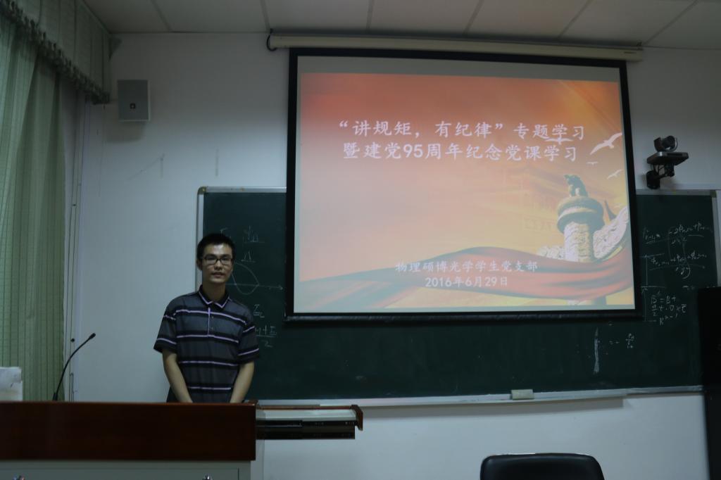 2016年6月29日晚,物理硕博光学学生党支部在物理系楼425房间开展了“讲纪律,有规矩”专题学习暨建党95周年庆祝活动,围绕“两学一做”,集体深入学习“四讲四有”专题二“讲规矩,有纪律”。光学党支部9名正式党员、2名预备党员参加会议,支部书记王鹏主持了会议。
