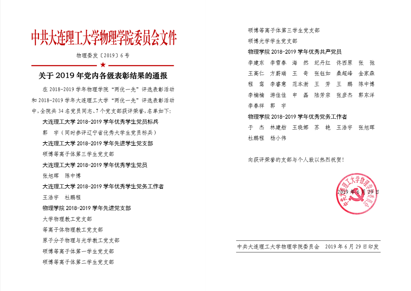 结合学校在全校学生党员中开展的“两优一先”评选表彰活动,乐鱼(中国)党委相应开展了学院层面的2018-2019学年“两优一先”评比活动,经各师生党支部及党员个人申报,共评选出学院优秀共产党员26名、优秀党务工作者8名、先进党支部7个。