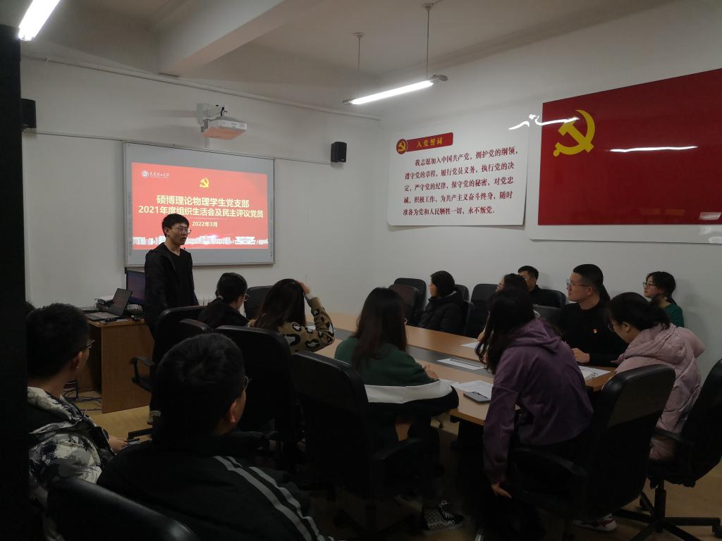 根据学校党委和学院党委的部署安排,硕博理论物理学生党支部于2022年3月10日晚7点在422会议室开展组织生活会与民主评议党员。本次会议由支部书记刘玉强同志主持,学院党委副书记于艳敏老师出席会议,支部全体党员参加会议。