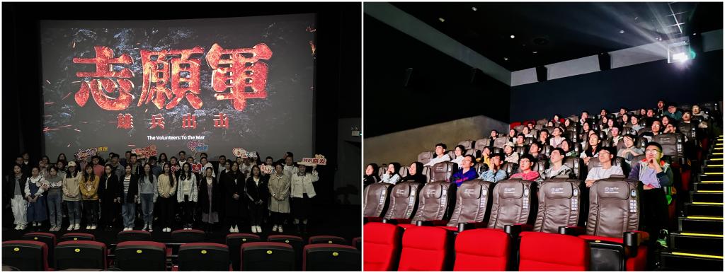 电影放映前,大家充满激情地讨论着抗美援朝的感人故事。这部影片以志愿军群像为主线进行叙事,全面呈现了新中国成立初,毛泽东和中共中央决策出兵朝鲜的艰难时刻到中国人民志愿军入朝打响第一、二次战役的故事及新中国特派代表首次参加联合国安理会的重要场景,重点介绍了三所里阻击战、龙源里阻击战和松骨峰阻击战。三场关键性战斗使美军几乎全部撤到三八线以南,一举奠定了整个朝鲜战争的最终局面。电影中有多处情节深深感染着我们,如大部队过江之前,志愿军总指挥彭德怀孤身入朝;38军113师要在14小时内长途奔袭70多公里,最终早敌军五分钟到达;松骨峰阻击战之后尸山血海中,一只焦黑血糊的手,缓缓举起。一幕幕壮观场景,一句句励志台词,回顾了抗美援朝战争胜利的伟大壮举,重现了中国人民保家卫国的烽火岁月,展现了中华儿女临危不惧、视死如归的英雄事迹。观影结束后,大家纷纷表示,志愿军战士用生命和鲜血所诠释的伟大抗美援朝精神将深深烙印在我们心里,将不断激励我们不断攻坚克难,披荆斩棘,用自己青春热血书写最美华章。