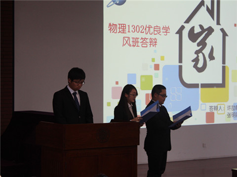 评审大会开始前,主持人2013级辅导员俞洲老师介绍了到场嘉宾及评分细则。随后便进入参评班级展示环节。每个班级有5分钟自由展示时间,之后由评委向展示同学提问。物1205班、物科1101班、物1302班等20个班级依次做了展示。每个班级都阐述了班级在过去几年里的班级学风建设和取得的成绩,也提出了未来的目标和展望。许多班级都在学习成绩以及思想建设上取得了很大的进步。建立了互帮学习、团结进取的学习风气。在场评委老师们也提出了一些意见和建议。