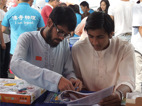 实验体验区则分为DIY奇妙实验和技巧性有奖尝试实验。包括错觉纸艺、硬币立于纸面、水面浮钉等趣味性实验。过往行人积极尝试,体验着物理知识的奇妙与动手的愉快。实验挑战区以面包板电路元件全套设备为挑战载体,分为个人挑战赛和双人挑战赛,当日挑战赛用最短时间连接成有特定功能的电路的参与者,则可有机会获得美丽的激光内雕一个。路人们积极参与其中,尤其是小孩子们对于动手操作充满兴趣,电路连成后会有激动的喜悦,并在解说员的指导下观看电路的功能。
