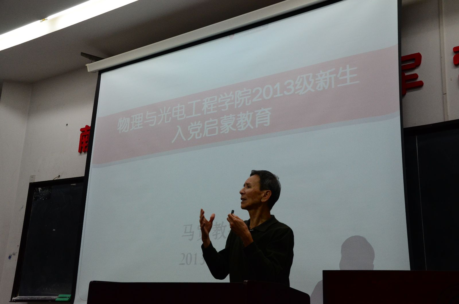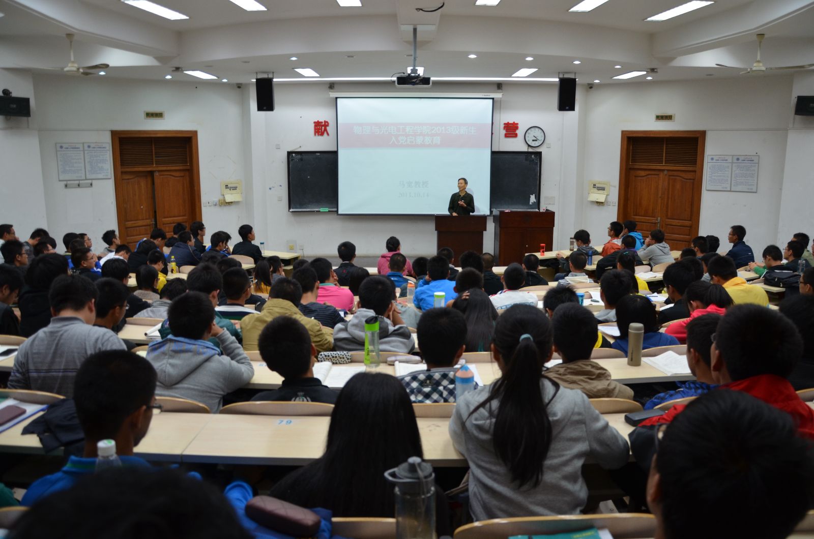 长期以来,入党启蒙教育一直是物理与光电工程学院新生入学教育的重要内容之一。10月14日,学院十分荣幸地邀请到了马宽教授,为乐鱼(中国)2013级全体学生开展入党启蒙教育。学院党委副书记兼副院长杨木老师,2013级辅导员俞洲老师出席了本次活动。
