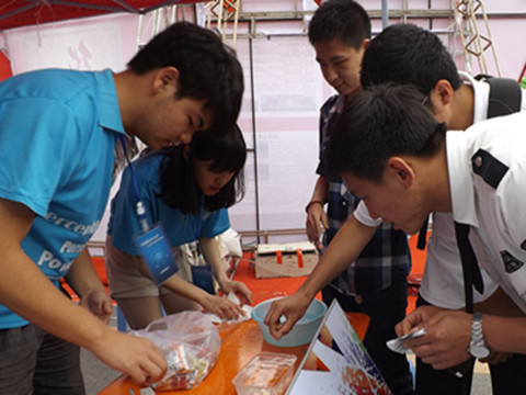 本届嘉年华,物理与光电工程学院展出的实验有水面浮针,灯泡敲钉子,有孔纸水,磁悬浮陀螺,用水做的火山,悬浮乒乓球以及比较高端的技术产品激光内雕。其中,灯泡敲钉子环节,观众在惊讶之余积极进行尝试。“用水做的火山”则仅用简单的冷水,热水,墨水实现了与实际火山别无二致的喷发现象。磁悬浮陀螺揭示了磁悬浮列车的原理。所有实验均收获了很好的展出效果。