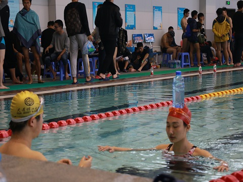 一大早,运动员们便早早来到游泳馆进行热身训练,虽然今天是小雪,外面天气寒冷还飘着雪花。但运动员们热情昂扬,比赛热情迅速升温。9点,比赛正式开始。首先进行的是个人比赛项目,包括男子50米蛙泳、女子50米仰泳、女子50米蛙泳。比赛过程紧张激烈,各学部学院的运动员们实力不相上下。经过激烈的角逐,我院大珩1401班同学沈越波在50米仰泳和蛙泳比赛中斩获亚军、季军。接下来的群体项目每组由6名同学组成,比赛内容是头顶水瓶水中接力。队员们在比赛开始前进行充分的热身运动,比赛中取得较好成绩。