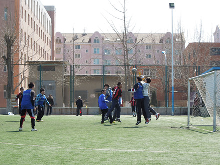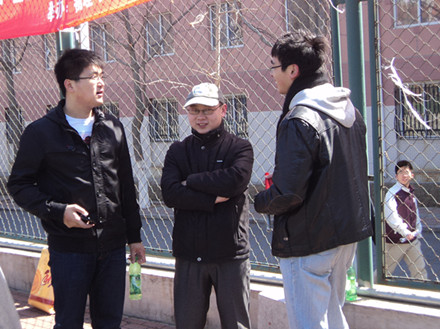 比赛开始前,球场周围就已经聚集了许多前来加油助威的同学。本场比赛还邀请到学院学生办公室主任兼2011级辅导员李一鸣和2010级辅导员佟西原担任裁判,因此吸引了更多的同学驻足观看。本场比赛三班穿着红色队服,而五班则身着蓝色队服。
