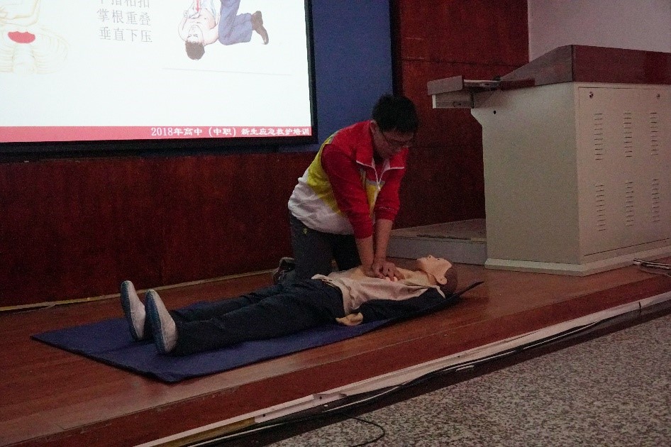 培训开始前,同学们先做一份急救知识检测题并进行自我介绍。第一项培训内容是介绍红十字会的起源和发展,以及红十字会的主旨和原则。随后是心肺复苏的技巧展示,在志愿者示范后,同学们上台展示学习成果。下一项培训内容是处理心肌梗塞问题,培训方法同样是先由志愿者示范再由学生展示。最后一项培训内容是对伤者的止血,包扎,固定和搬运。此项培训内容所采用的方法是在志愿者示范结束后,同学们两人一组互相包扎练习。当所有的培训内容结束后,又让参与培训的学生重新做一遍一开始发放的急救知识检测题,以检验此次培训的效果。